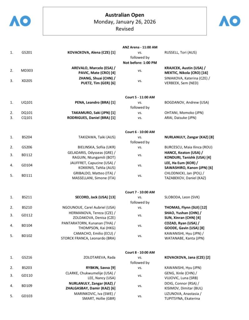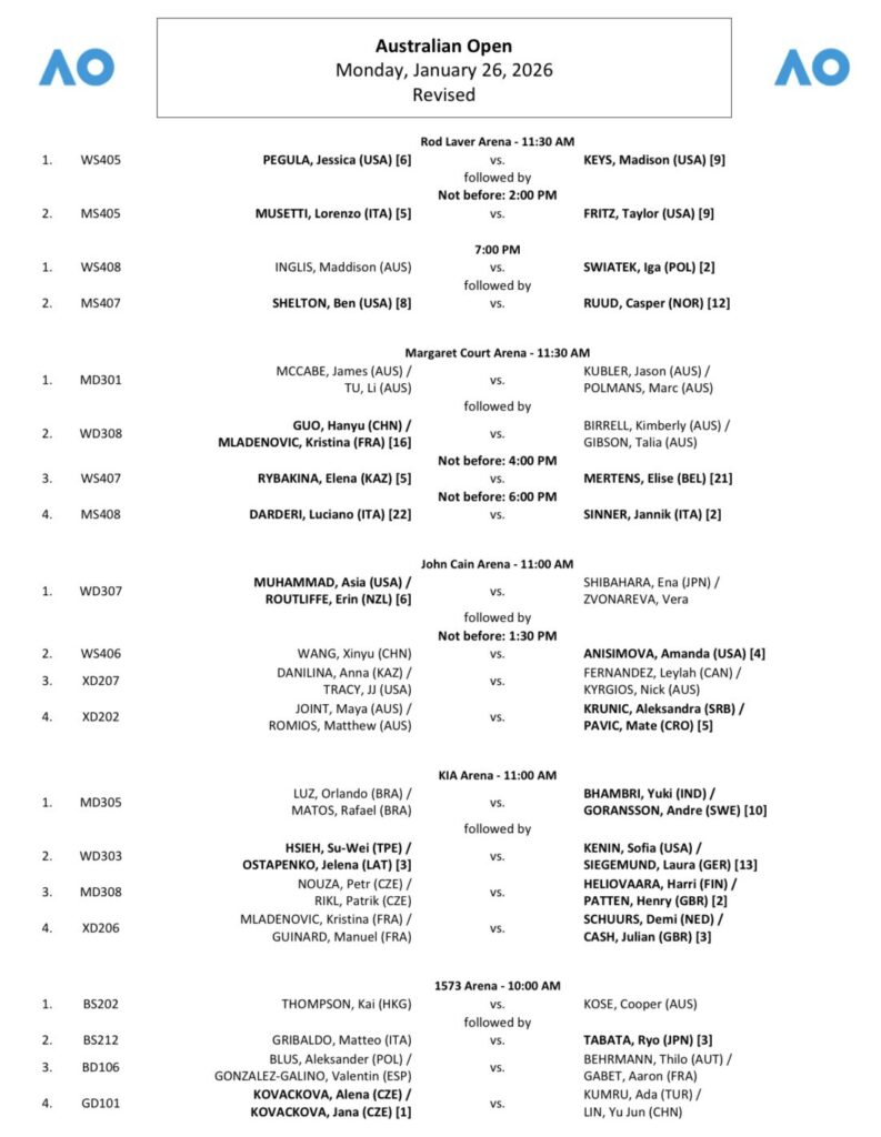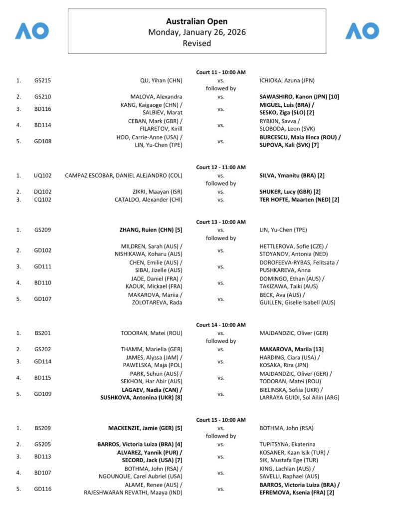 Todo listo para una nueva jornada de los cuadros principales del Abierto de Australia 2026, primer Grand Slam del año, que se juega en las canchas de cemento de Melbourne Park. La acción del lunes 26 de enero comenzará a las 11:30 a.m. (hora local), es decir, a las 7:30 p.m. del domingo en la noche (hora de Colombia).