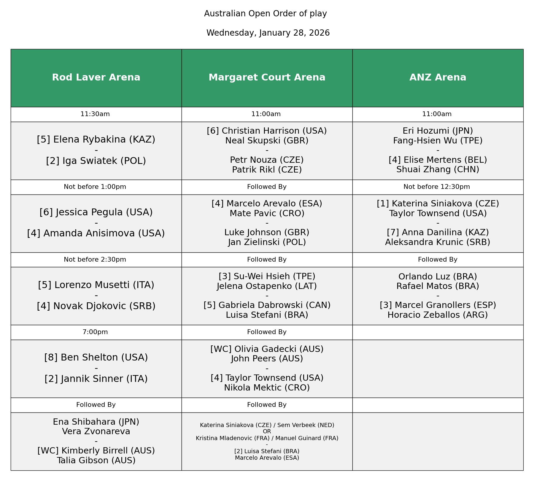 Todo listo para una nueva jornada de los cuadros principales del Abierto de Australia 2026, primer Grand Slam del año, que se juega en las canchas de cemento de Melbourne Park. La acción del miércoles 28 de enero en la Rod Laver Arena, cancha principal, comenzará a las 11:30 a.m. (hora local), es decir, a las 7:30 p.m. del martes en la noche (hora de Colombia); entre tanto, en la Margaret Court y ANZ Arena media hora antes.