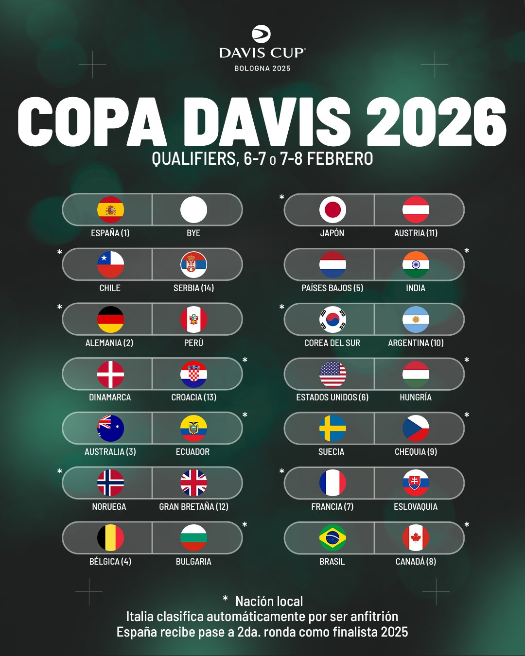 Chile se medirá con Serbia como local, en una serie que podría tener como protagonista a Novak Djokovic si decide participar. Argentina viajará a Asia para enfrentar a Corea del Sur. Ecuador tendrá un desafío mayúsculo contra Australia, mientras que Perú se verá las caras con Alemania. Brasil, por su parte, jugará ante Canadá, que cuenta con figuras como Félix Auger-Aliassime y Denis Shapovalov.