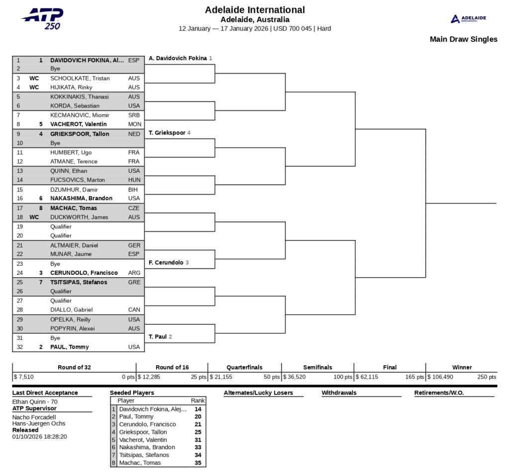El segundo preclasificado será el estadounidense Tommy Paul, el tercero el argentino Francisco Cerúndolo y el cuarto el neerlandés Tallon Griekspoor, tenistas que verán acción a partir de la segunda ronda. De hecho, Cerúndolo es el único jugador del área que competirá en el certamen adelaidano. A continuación, el cuadro principal: