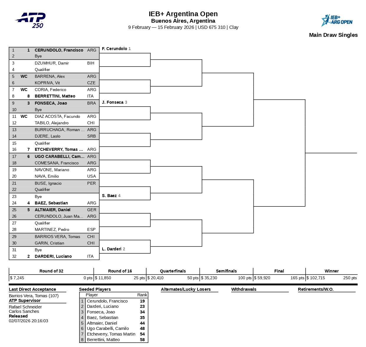 A continuación, el cuadro principal del ATP 250 Buenos Aires 2026: