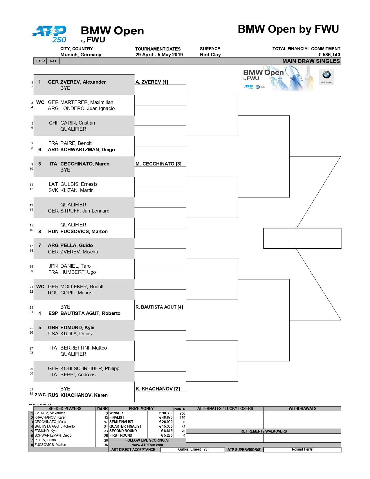 Zverev por su condición de primer preclasificados verá acción a partir de la segunda ronda, ante el vencedor del duelo entre su compatriota Maximilian Marterer y el argentino Juan Ignacio Londero. El segundo sembrado será el ruso Karen Khachanov, mientras que, el italiano Marco Cecchinato y el español Roberto Bautista-Agut completan el grupo de los cuatro primeros sembrados.
