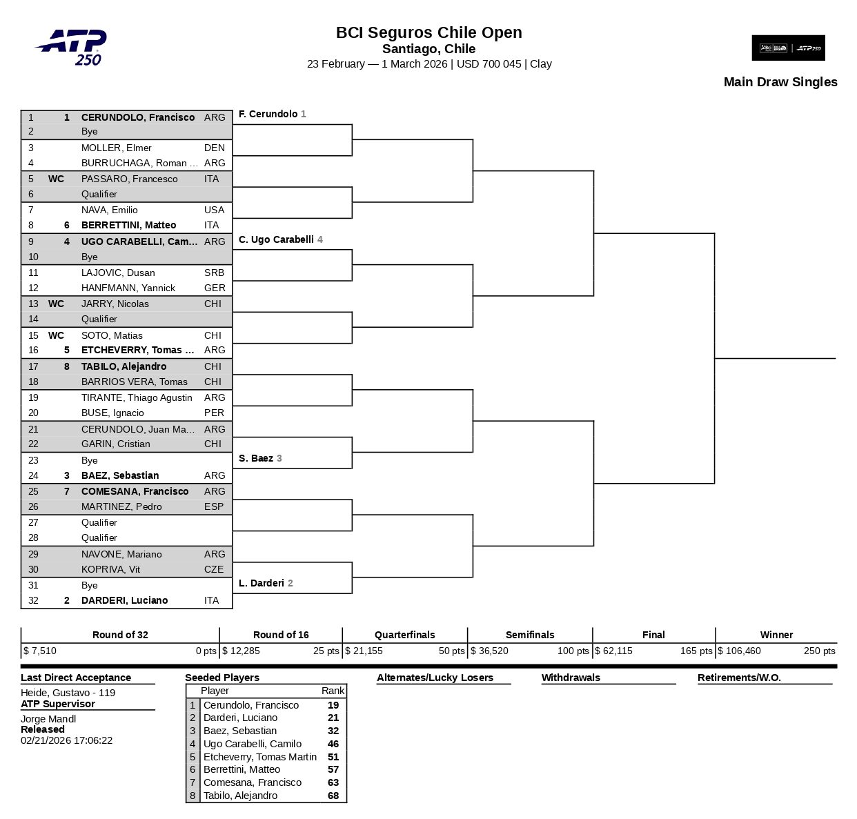 El Circuito ATP se despide de Sudamérica en este 2026 y es el ATP 250 Santiago de Chile la última cita. El argentino Francisco Cerúndolo, N.° 19 del ranking ATP y el italiano Luciano Darderi, ubicado en la 21ª colocación figuran como los primeros preclasificados; en el ATP 250 Buenos Aires (Argentina) y el ATP 500 Rio de Janeiro (Brasil) también lo hicieron.