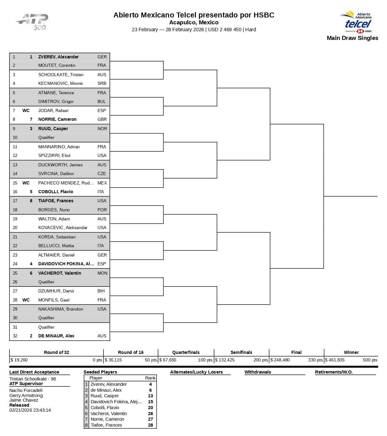 El balneario mexicano de Acapulco se alista para recibir su ATP 500, certamen que en esta oportunidad tendrá a dos jugadores del top-10 en competencia, siendo estos el alemán Alexander Zverev y el australiano Alex De Miñaur, quienes se ubican en la cuarta y sexta casilla de la clasificación mundial, respectivamente.