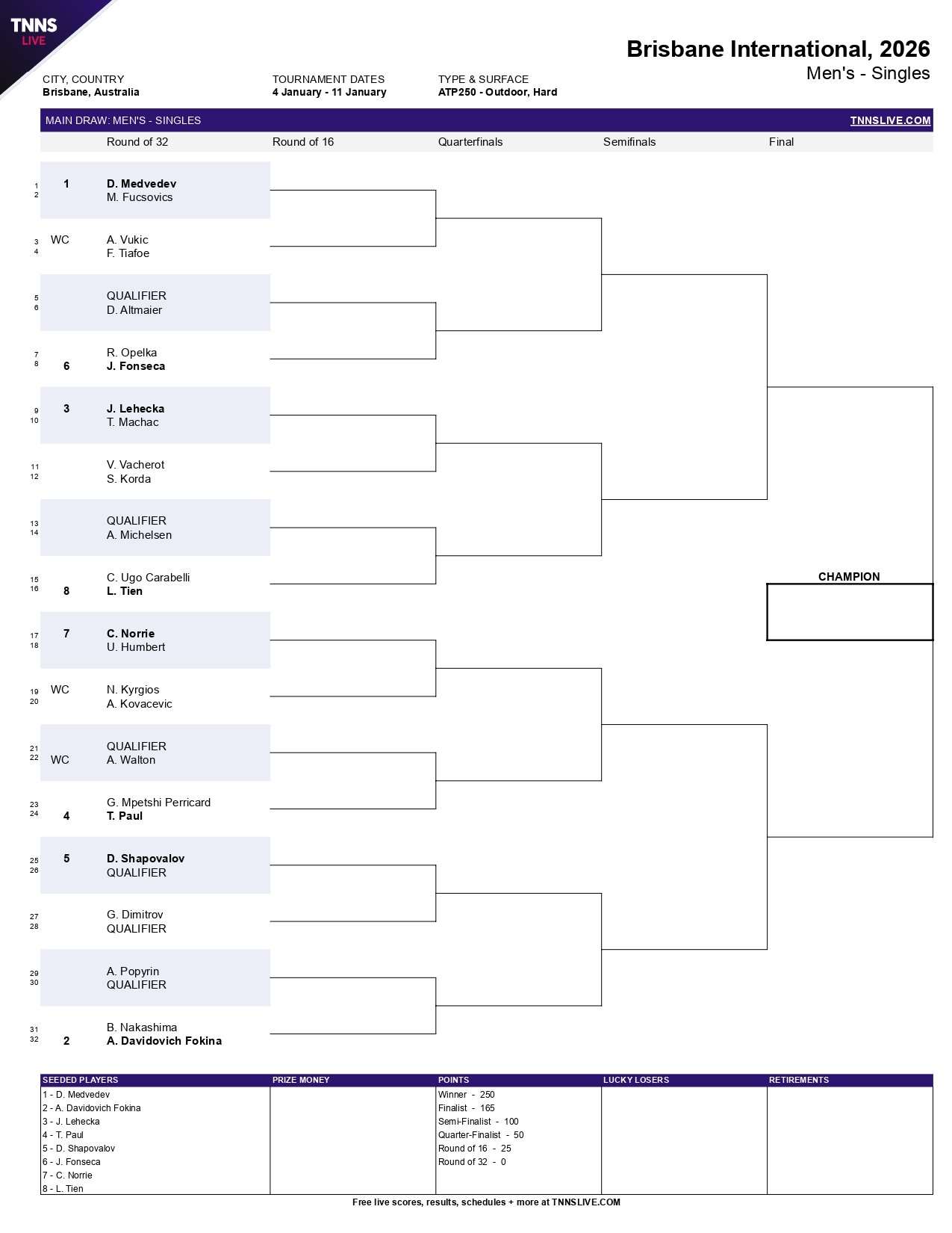 Ya tenemos el primer cuadro principal de la temporada 2026 y con ello, llega el ATP 250 de Brisbane que contará con tres jugadores del Top 20 como favoritos al trofeo, siendo estos Daniil Medvedev, Alejandro Davidovich y Jiri Lehecka, además de contar con nombres como Frances Tiafoe, Sebastián Korda, Grigor Dimitrov o Giovanni Mpetshi Perricard.