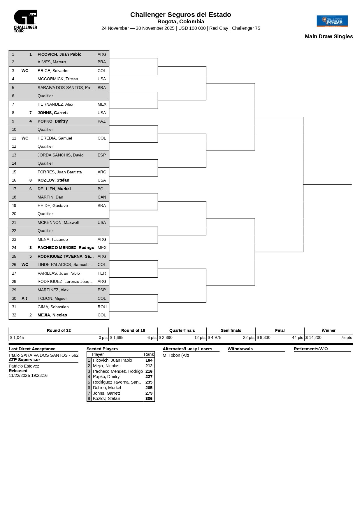 Este es el cuadro principal del ATP Challenger 75 de Bogotá: