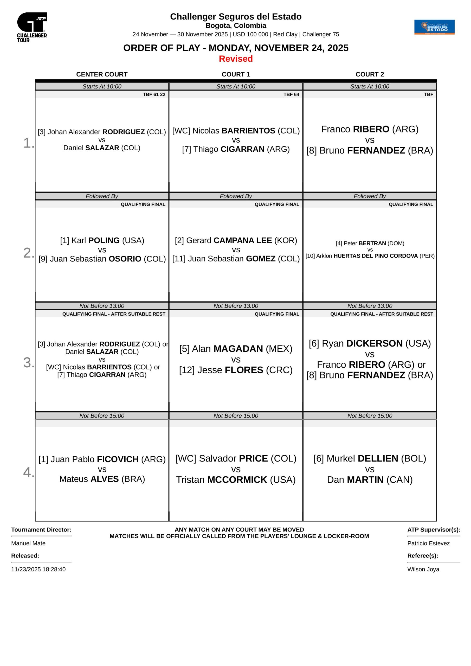 Esta es la programación del lunes 24 de noviembre en el ATP Challenger 75 de Bogotá: