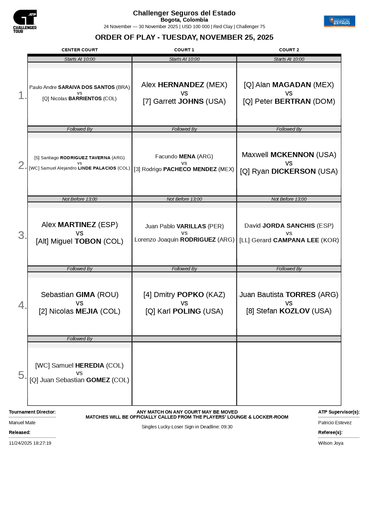 En la Cancha Central destacan Nicolás Barrientos que avanzó a su primer cuadro principal Challenger desde 2022, las promesas Samuel Linde, Miguel Tobón y Samuel Heredia, este último finalista del ITF M25 de Cochabamba, así como Nicolás Mejía, segunda mejor raqueta del país y favorito al trofeo en la capital. La jornada dará inicio desde las 10:00 AM (Hora Colombiana) y se podrá seguir en vivo a través de Challenger TV.
