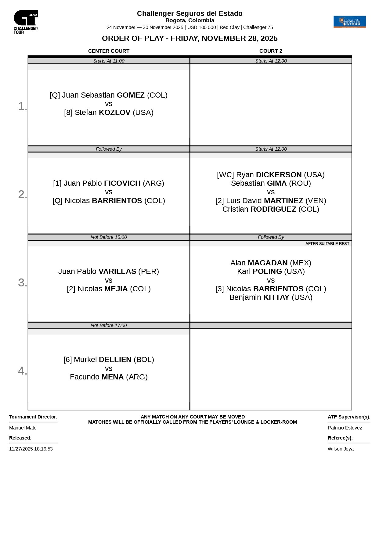 Esta es la programación del viernes 28 de noviembre en el ATP Challenger 75 de Bogotá: