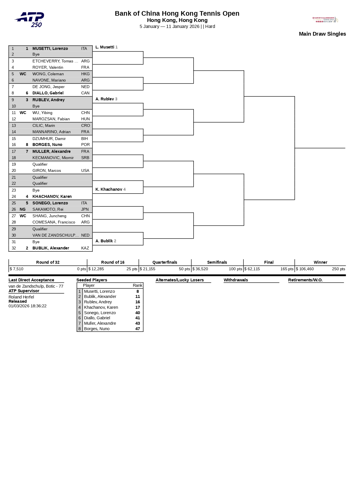 Este es el cuadro principal del ATP 250 de Hong Kong 2026:
