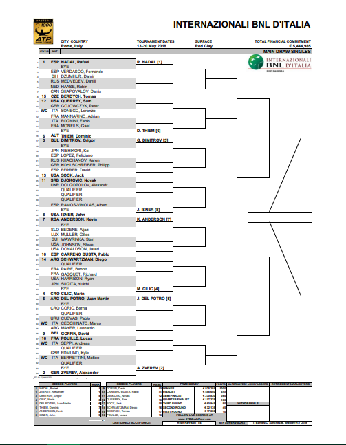 Fue sorteado el cuadro principal del ATP Masters 1000 de Roma, que será el 5º torneo de la categoría en lo que va de la temporada -3º sobre polvo de ladrillo- y, a su vez, la antesala para la cita en Roland Garros.