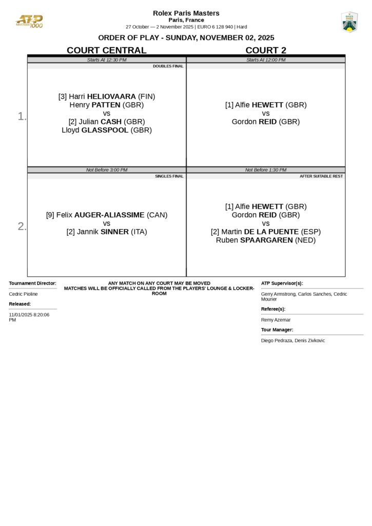 Llega el último día del Masters 1000 de París y se jugará la final de sencillos donde conoceremos al último campeón de torneos de la categoría de la temporada. Frente a frente tendremos a Jannik Sinner ante Felix Auger-Aliassime, cada uno con objetivos distintos en este encuentro.