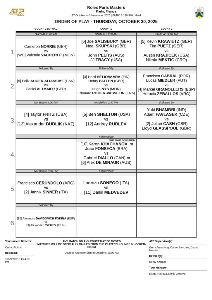 Además, en la segunda cancha en importancia se presentará Daniil Medvedev enfrentando a Lorenzo Sonego, con el ruso que no jugó este miércoles por walkover de Grigor Dimitrov. La acción en París dará inicio desde las 11 de la mañana hora local, 5 de la mañana en Colombia.