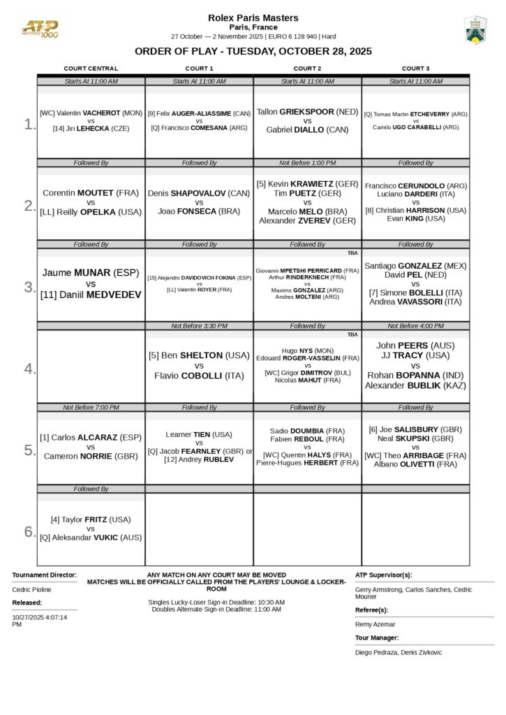 Llega una nueva jornada del último Masters 1000 de la temporada que se desarrolla en la ciudad de París. En esta oportunidad se jugarán los últimos partidos de la primera ronda de sencillos, mientras que empezarán a debutar algunos de los preclasificados desde la segunda ronda.