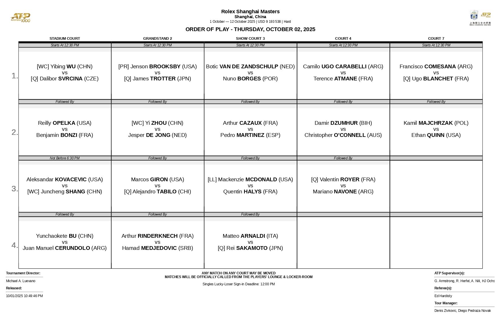 Este jueves continúa la acción del cuadro principal del ATP Masters 1000 Shanghái (China), penúltimo torneo de estas características en el presente año y el cual no tendrá en competencia al español Carlos Alcaraz, actual N.º 1 del ranking ATP y quien dio un paso al costado tras consagrarse campeón del ATP 500 Tokio (Japón).