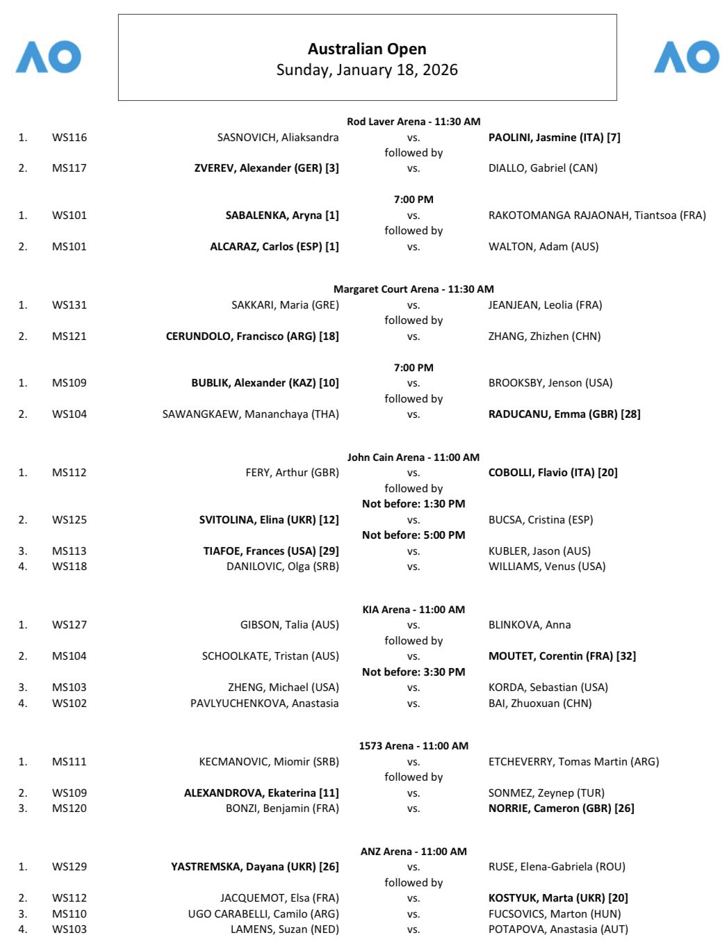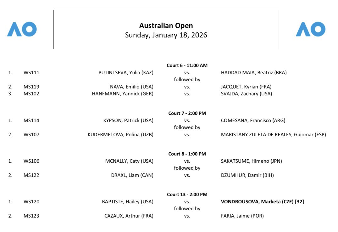 Todo listo para el inicio de los cuadros principales del Australian Open 2026, primer Grand Slam del año, a jugarse en las canchas de cemento de Melbourne Park. La acción empezará el próximo domingo 18 de enero a las 11:00 a.m. (hora local), es decir, a las 7:00 p.m. del sábado en la noche (hora de Colombia), y en el primer día de competencias habrá 32 partidos, 16 en el torneo masculino y los restantes en la competencia femenina.