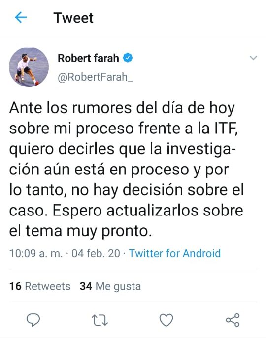 El tenista colombiano se pronunció en sus redes sociales, pero borró el twett Tras la información que circula en redes sociales, donde se indica que Robert Farah quedaría libre de …