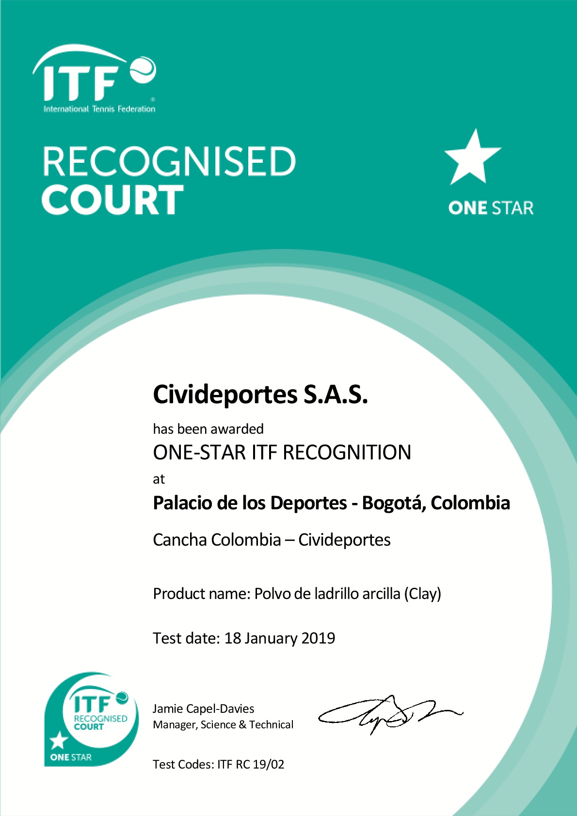 Luego de una minuciosa inspección, tras una visita por parte de la ITF el pasado viernes 18 de enero, el ente que rige el ‘deporte blanco’ a nivel mundial tomó la decisión de otorgarle a Civideportes, empresa encargada de la construcción de la cancha de tenis en el Palacio de los Deportes ‘Carlos Arturo Rueda C’ esta certificación, siendo la primera en 2019 y la tercera cancha sobre polvo de ladrillo a nivel mundial, luego de la del National Tennis Centre de Bratislava (Eslovaquia) y la del Sichuan International Tennis Center en Sichuan (China).