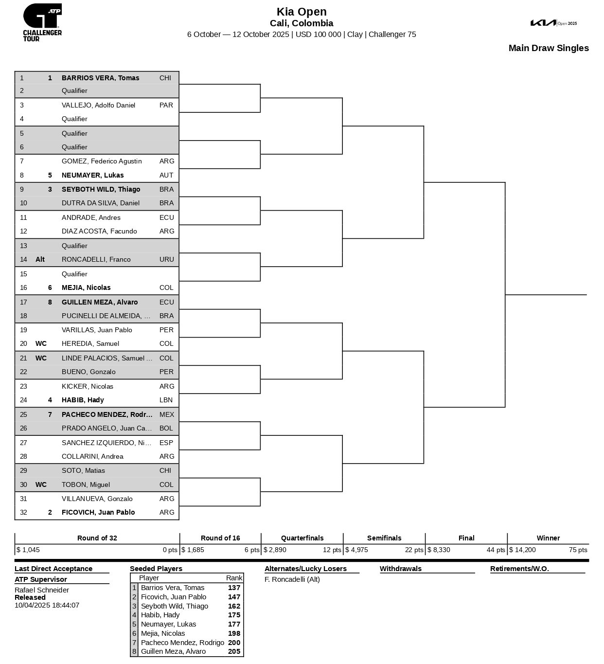 De momento, son cuatro colombianos en el cuadro principal, pues además de ‘Nico’, figuran los también integrantes del Equipo Colsanitas Samuel Linde y Samuel Heredia; además de Miguel Tobón. A continuación, el cuadro principal del Challenger Cali 2025: