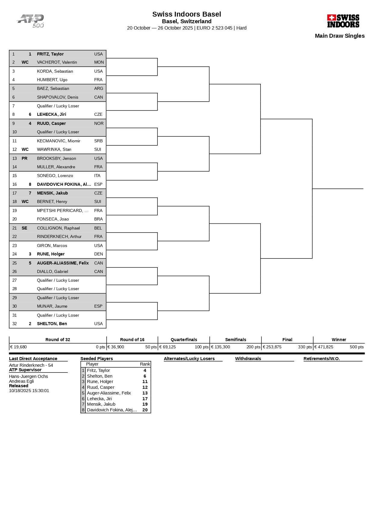 En el cuadro que lo lideran dos estadounidenses, Taylor Fritz, como siembra 1 del torneo, tendrá un duelo inicial ante el campeón del ATP Masters 1000 de Shanghái, el monegasco, Valentin Vacherot mientras que Ben Shelton, finalista de la edición 2024, espera rival desde la fase previa.