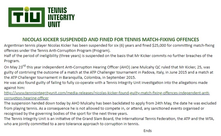 No son nada alentadoras las noticias para el argentino Nicolás Kicker. Este martes, la Unidad de Integridad del Tenis (TIU -en inglés-) hizo oficial la sanción para el jugador oriundo de Merlo, luego de hallarlo culpable por el amaño de partidos en los Challengers de Padua (Italia) y Barranquilla, ambos en el año 2015. Además, fue declarado responsable por no cooperar con la investigación de la TIU sobre las acusaciones hechas en su contra.