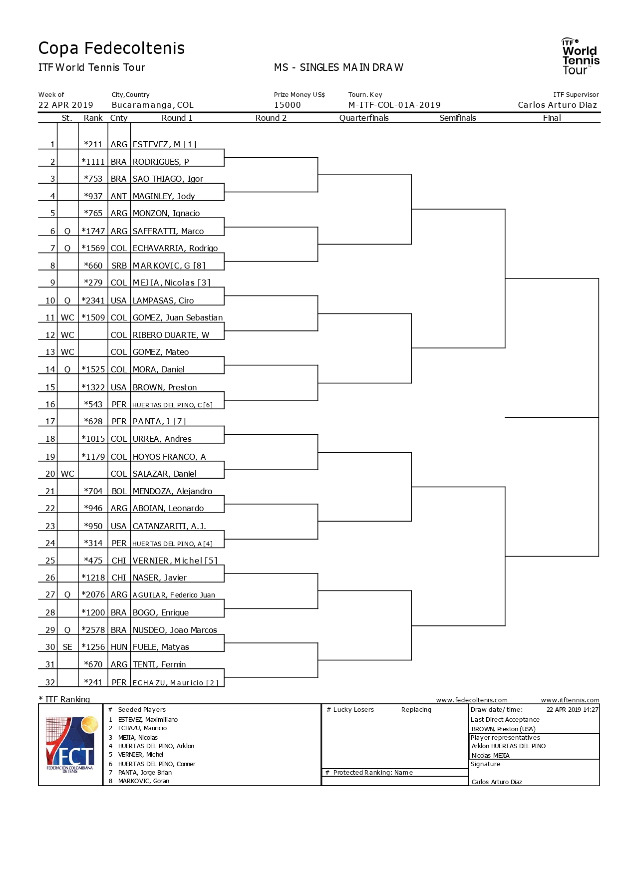 Entre las raquetas nacionales se destaca la presencia de Nicolás Mejía, así como la de los juveniles Mateo Gómez y Daniel Salazar. A continuación, podrás consultar el cuadro en su totalidad: