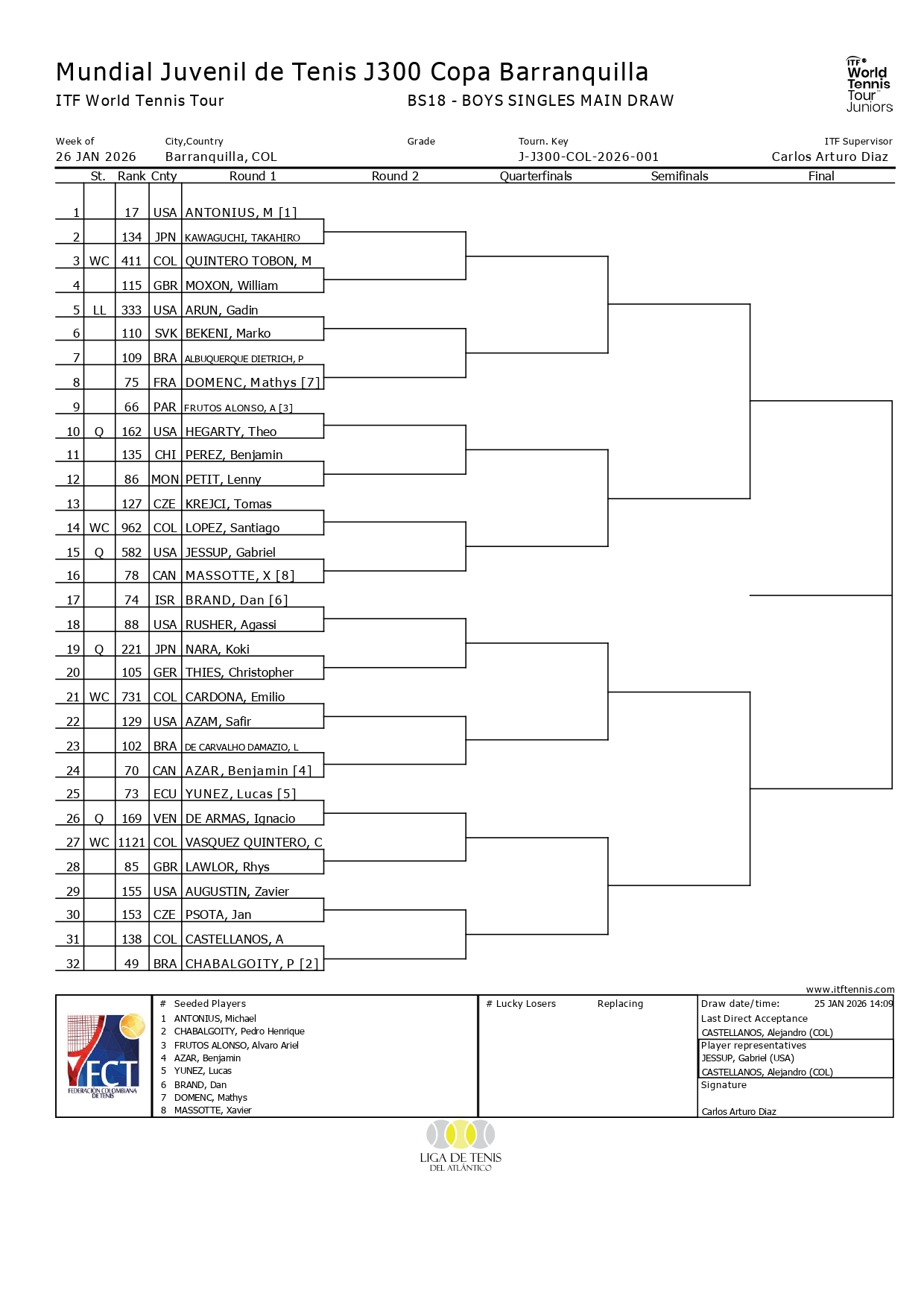 A continuación, el cuadro principal masculino del ITF J300 Barranquilla 2026: