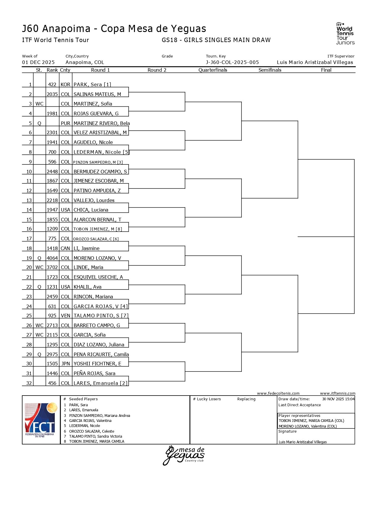 A continuación, el cuadro principal femenino del ITF J60 Anapoima en el que dicen presente 25 tenistas locales: