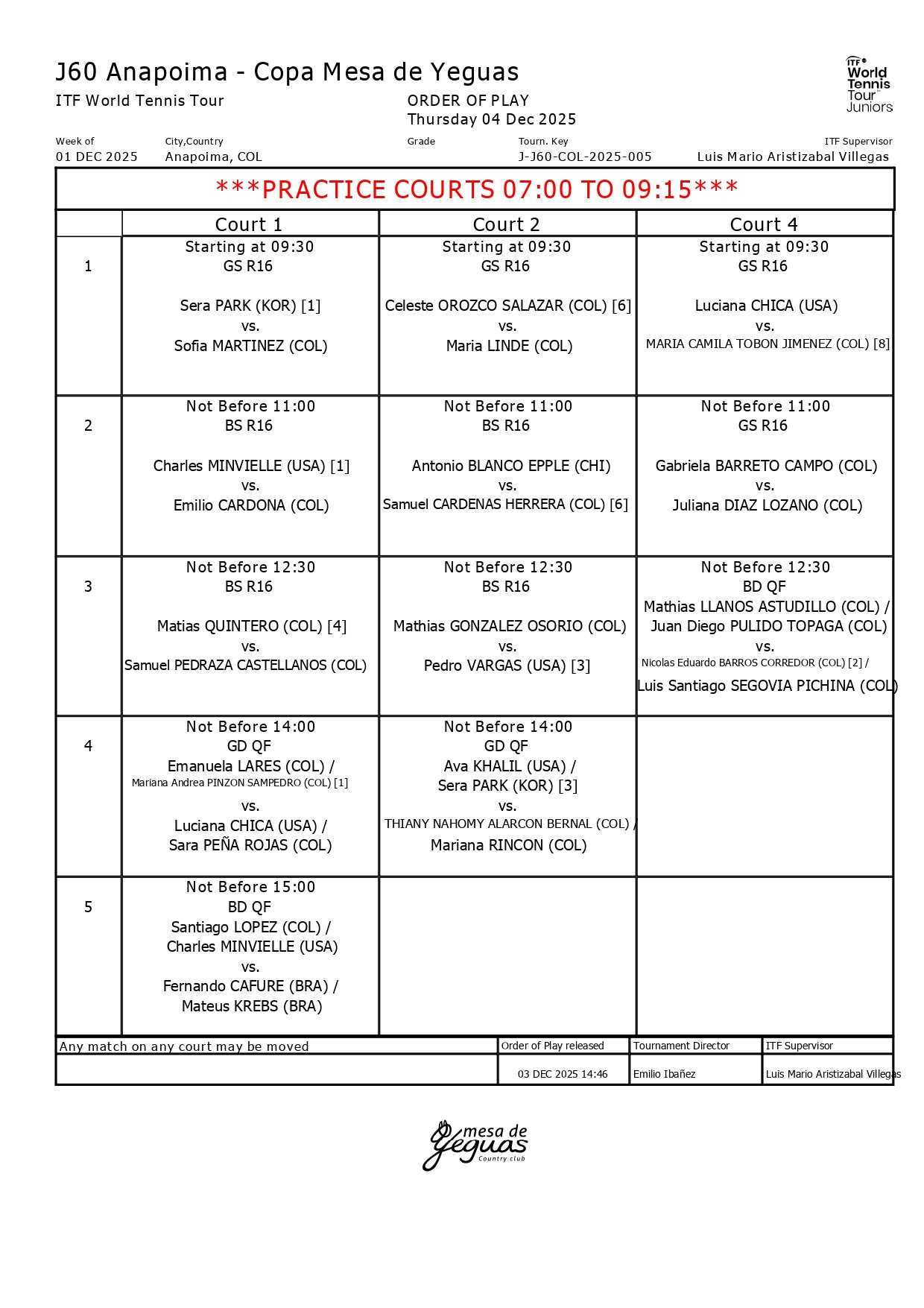 Este miércoles sigue la acción en los cuadros principales de la Copa FCT, certamen ITF J60 del Circuito Mundial Junior que tiene como sede las canchas de polvo de ladrillo de Mesa de Yeguas Country Club en el municipio de Anapoima (Cundinamarca). En la cuarta jornada se realizarán 12 partidos (8 en sencillos y 4 en dobles), correspondientes, en singles a la segunda ronda y en dobles a los cuartos de final.