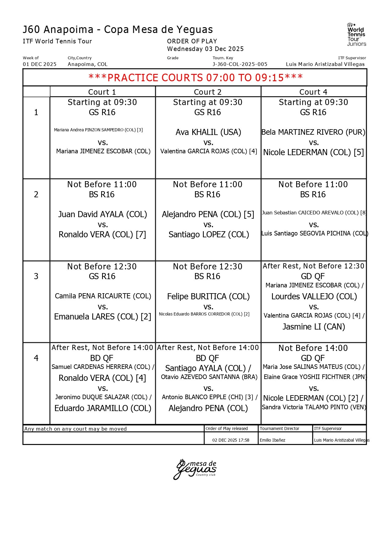 Este miércoles sigue la acción en los cuadros principales de la Copa FCT, certamen ITF J60 del Circuito Mundial Junior que tiene como sede las canchas de polvo de ladrillo de Mesa de Yeguas Country Club en el municipio de Anapoima (Cundinamarca). En la tercera jornada se realizarán 12 partidos (8 en sencillos y 4 en dobles), correspondientes, en singles a la segunda ronda y en dobles a los cuartos de final.