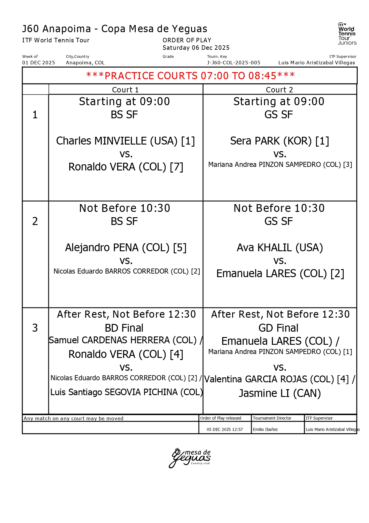 Este sábado sigue la acción en los cuadros principales de la Copa FCT, certamen ITF J60 del Circuito Mundial Junior que tiene como sede las canchas de polvo de ladrillo de Mesa de Yeguas Country Club en el municipio de Anapoima (Cundinamarca). En la sexta jornada se realizarán seis partidos (cuatro en sencillos y dos en dobles), correspondientes, en singles a las semifinales y en dobles a las finales.