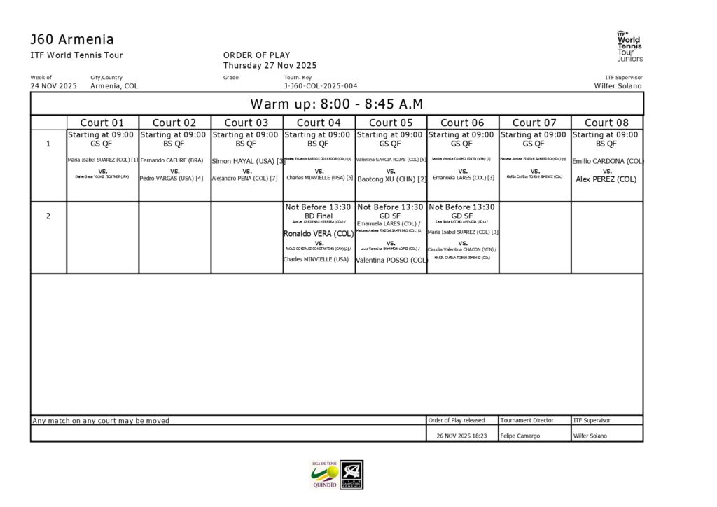 En total se jugarán once partidos, ocho en la modalidad de sencillos y tres más en dobles. A continuación, el orden del día en el ITF J60 Armenia 2025: