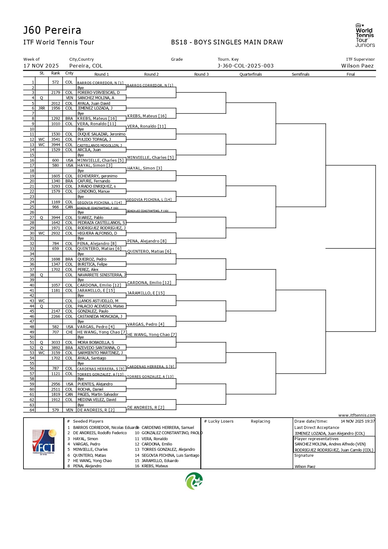 A continuación, el cuadro principal masculino del ITF J60 Pereira: