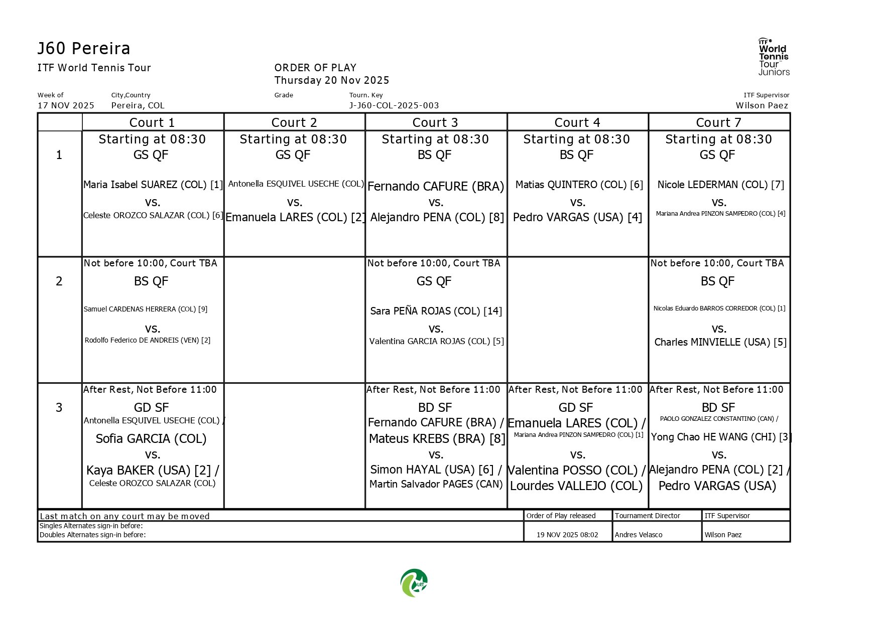 Cuarta jornada de competencia en los cuadros principales, tanto masculino como femenino, del ITF J60 Pereira, torneo que tiene como sede las canchas de polvo de ladrillo de la Liga Risaraldense de Tenis y el cual integra la última gira de competencias en este 2025 en suelo cafetero de certámenes del Circuito Mundial Junior.