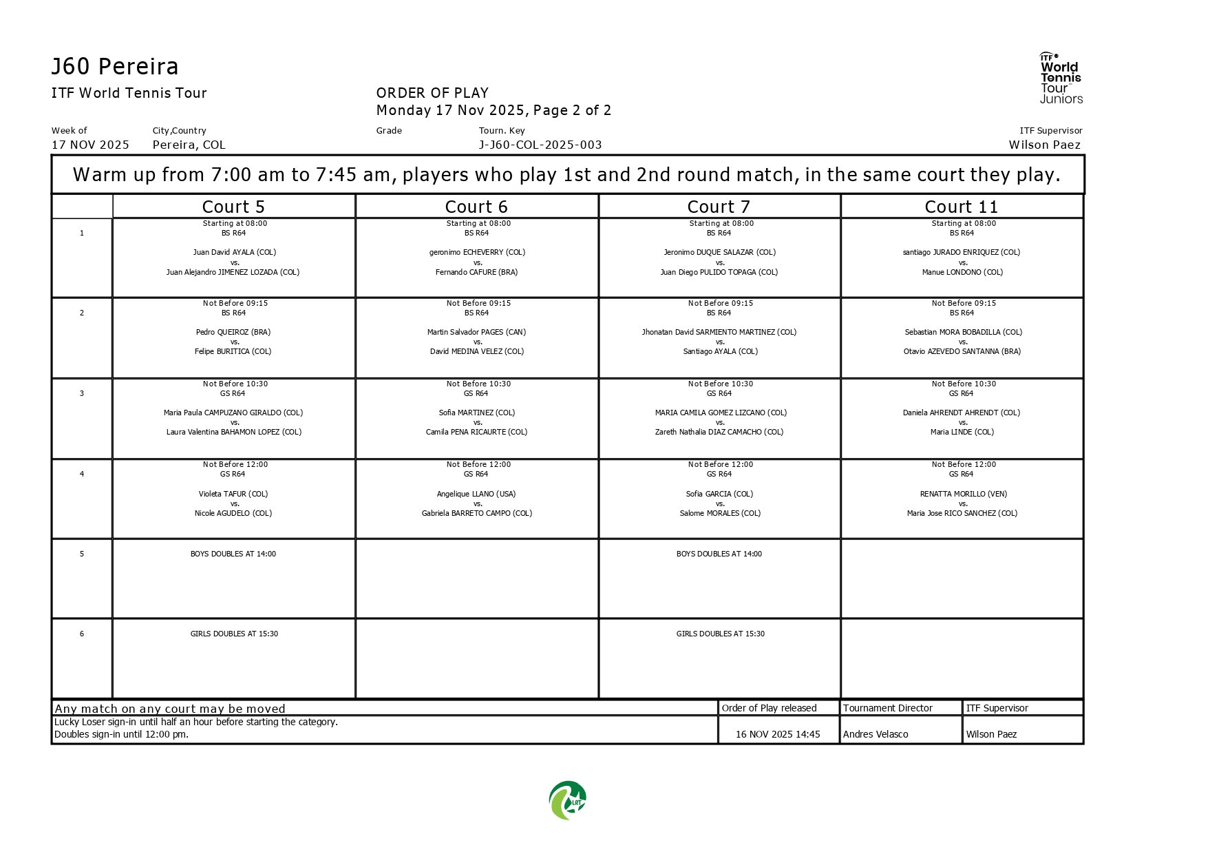 Todo listo para que este lunes de comienzo los cuadros principales, tanto masculino como femenino, del ITF J60 Pereira, torneo que tiene como sede las canchas de polvo de ladrillo de la Liga Risaraldense de Tenis y el cual integra la última gira de competencias en este 2025 en suelo cafetero de certámenes del Circuito Mundial Junior.