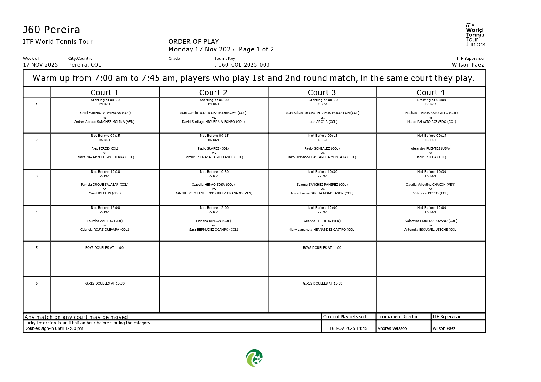Todo listo para que este lunes de comienzo los cuadros principales, tanto masculino como femenino, del ITF J60 Pereira, torneo que tiene como sede las canchas de polvo de ladrillo de la Liga Risaraldense de Tenis y el cual integra la última gira de competencias en este 2025 en suelo cafetero de certámenes del Circuito Mundial Junior.