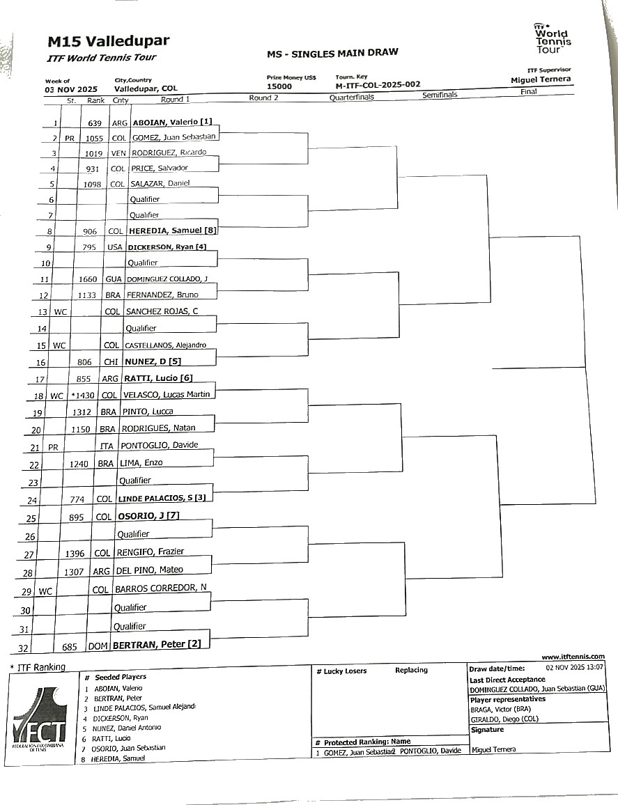 Este es el cuadro principal del ITF M15 de Valledupar 2025: