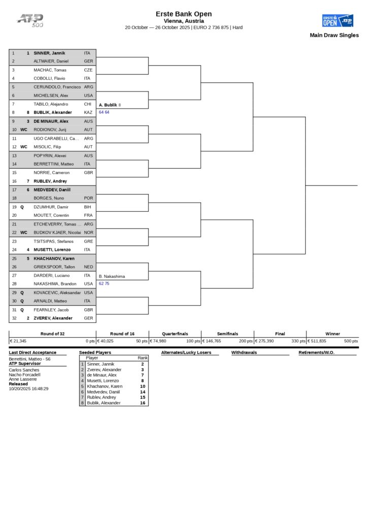 Llega uno de los dos últimos ATP 500 de la temporada y es el torneo de Viena, una parada obligatoria para muchos de los jugadores top para lo que es la parte final de la temporada. De hecho, la principal atracción es el 2 del mundo, Jannik Sinner, quien es uno de los cinco top-10 que dicen presente en el cuadro.