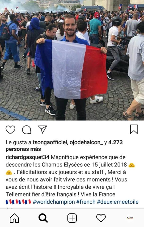 Una vez finalizado el encuentro, la alegría se trasladó hasta territorio francés, más precisamente hasta Les Champs Élysées (Los Campos Elíseos), donde estuvo Richard Gasquet. El jugador de 32 años publicó una foto en su perfil de Instagram con la bandera del nuevo campeón de la FIFA, mientras transitaba por la avenida más importante de la Ciudad Luz junto a miles de compatriotas.