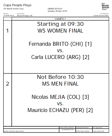 Se cierra el telón del ITF de Bucaramanga. Luego de siete días a puro tenis en el Club Campestre de la ‘Ciudad Bonita’ de Colombia, tan solo cuatro jugadores mantienen la ilusión de consagrarse campeones: Fernanda Brito, Carla Lucero -en la rama femenina- Nicolás Mejía y Mauricio Echazú -entre los hombres- son los aspirantes al título.