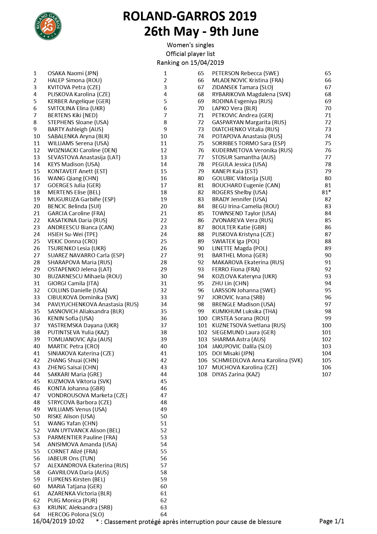 Roland Garros presentó su lista de entrada en la rama femenina, y un total de 108 tenistas tienen su tiquete asegurado en el segundo Grand Slam del año, 107 de ellas ingresan directamente; mientras que la estadounidense Shelby Rogers es la única que hace uso del ranking protegido.