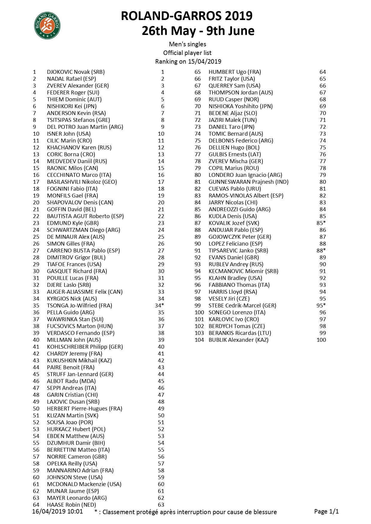 En la lista de los 104 tenistas que tienen su cupo fijo en París, hay cuatro que hicieron uso del ranking protegido. El francés Jo-Wilfried Tsonga, el eslovaco Jozef Kovalik, el serbio Janko Tipsarevic y el alemán Cedrik-Marcel Stebe.