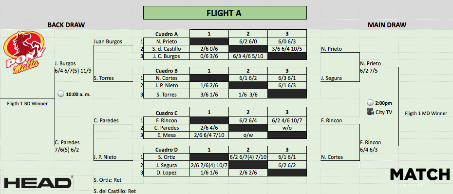 En el Flight A, Nicolás Prieto derrotó en el encuentro de semifinales a Jorge Andrés Segura con parciales de 6-2 y 7-5. Mientras, en la parte de abajo del cuadro, Felipe Rincón dejó en el camino a Nicolás Cortés en sets corridos de 6-3 y 6-4. La final entre los jugadores bogotanos se disputará este sábado a las 2 de la tarde.
