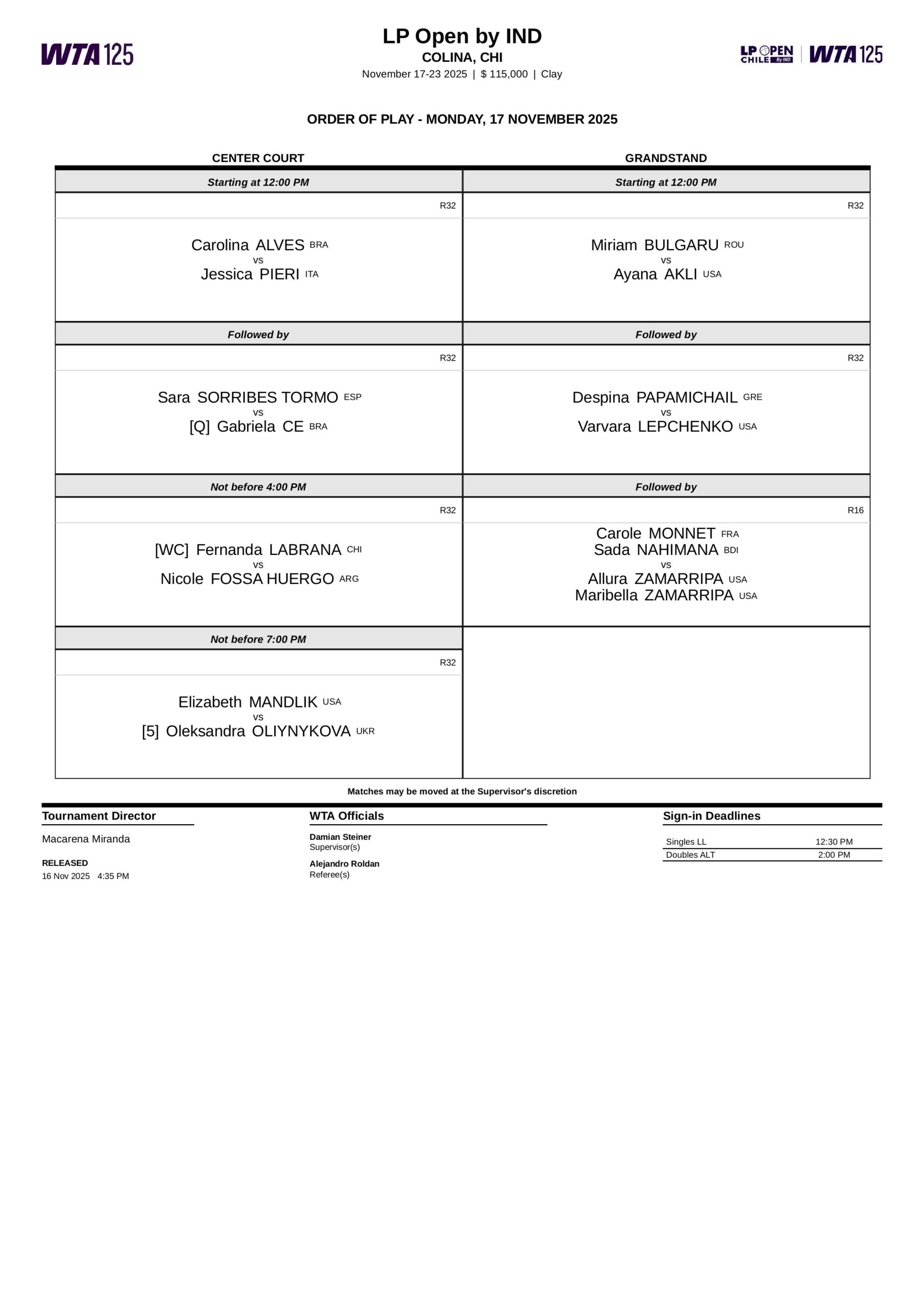Esta es la programación del 17 de noviembre en el WTA 125 de Colina:
