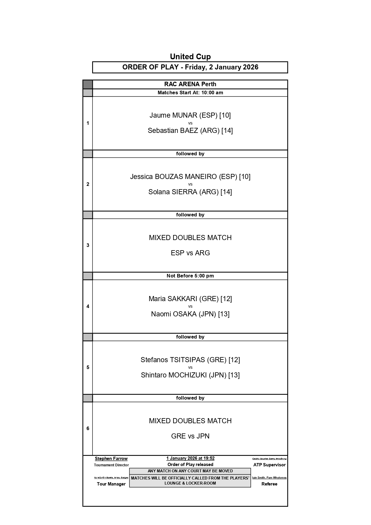 El gran atractivo de la jornada será el debut de Naomi Osaka en la competición, quien abrirá la eliminatoria frente a Maria Sakkari. A continuación, Stefanos Tsitsipas, buscará su triunfo ante Shintaro Mochizuki, 99° del ranking ATP.