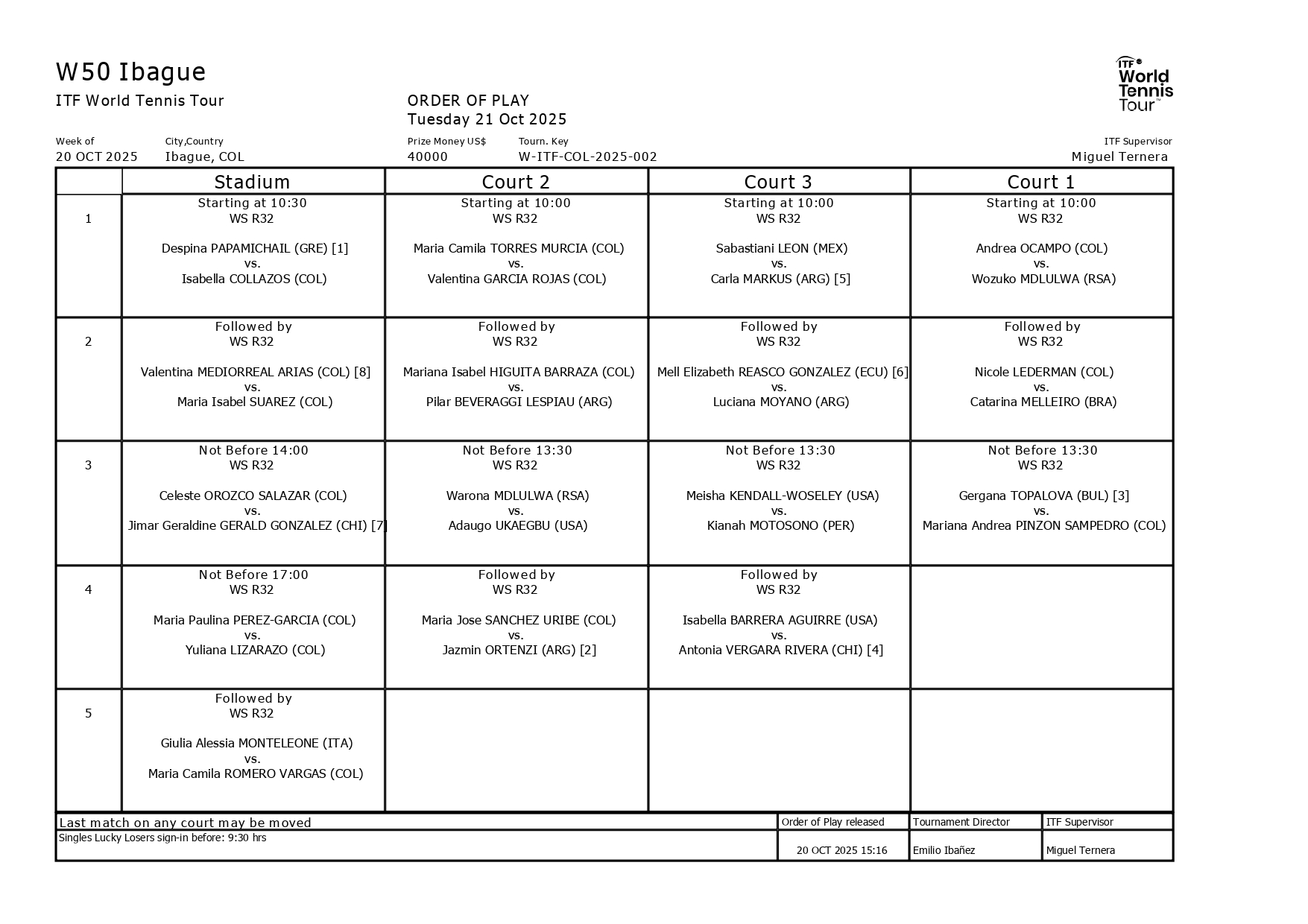 La acción en Ibagué empezará sobre las 10:00 a.m. y se emplearán cuatro canchas, siendo el estadio en el que más partidos se realizará con cinco. A continuación, la programación del martes 21 de octubre en el W50 Ibagué: