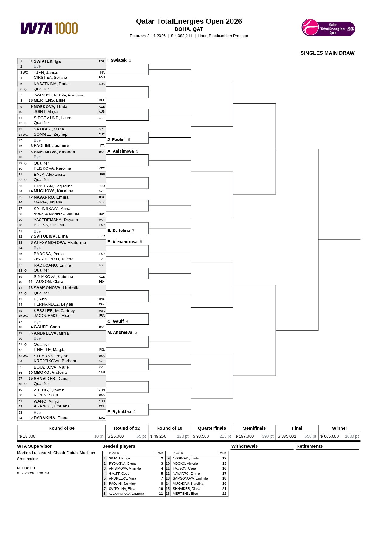 A continuación, el cuadro principal del WTA 1000 Doha 2026: