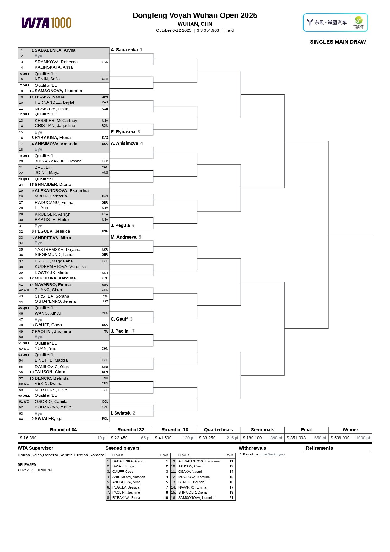 La única suramericana será la colombiana Camila Osorio, quien recibió carta de invitación por parte de la organización; a continuación, el cuadro principal del WTA 1000 Wuhan (China) 2025: