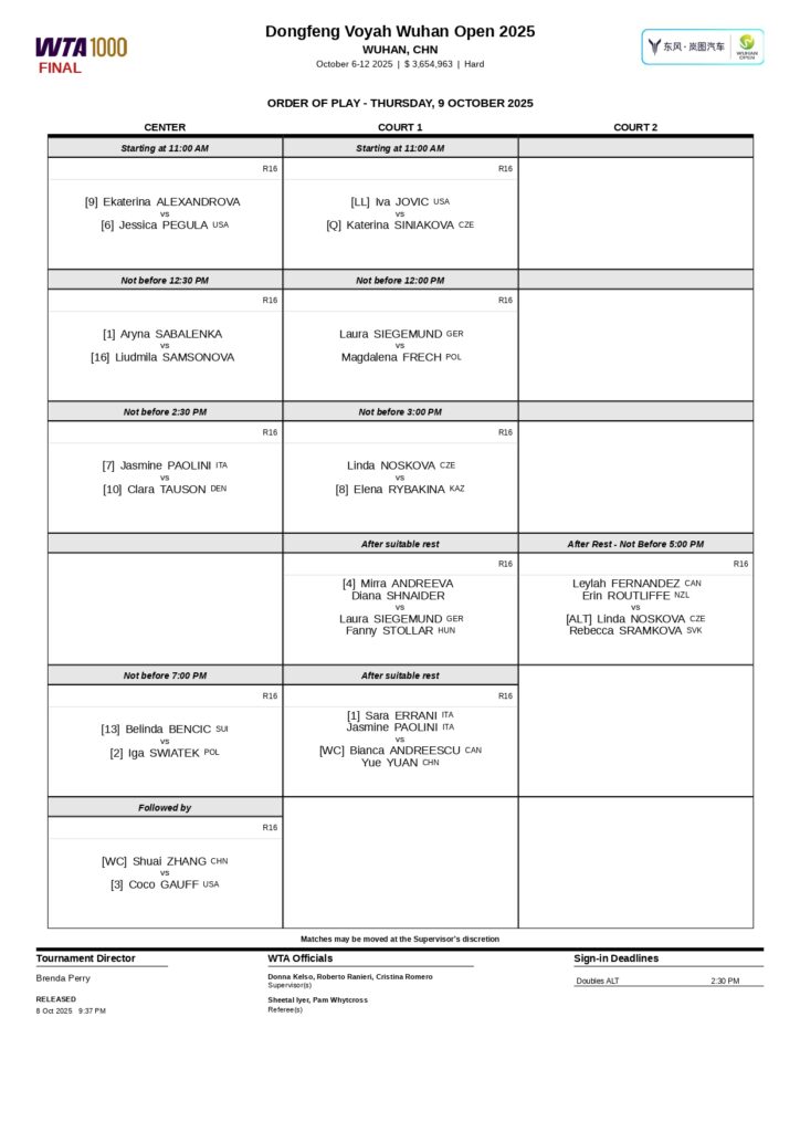 Llegamos al cuarto día de cuadro principal en el WTA 1000 de Wuhan y es momento de que se jueguen todos los partidos de octavos de final. En esta oportunidad veremos en cancha a todos los grandes nombres que siguen en carrera en el torneo, tales como Aryna Sabalenka, Iga Swiatek, Coco Gauff o Elena Rybakina.