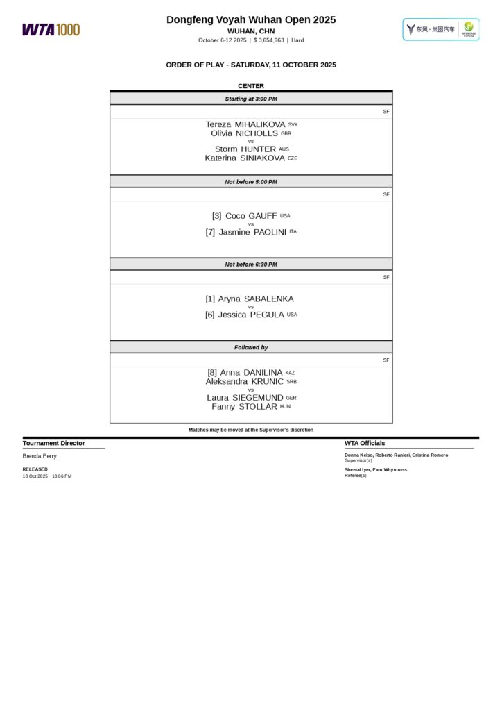 Llegamos al sexto día de cuadro principal en el WTA 1000 de Wuhan y es momento de presenciar todos los partidos de semifinales en sencillos. Esta ronda contará con grandes nombres presentes, tales como Aryna Sabalenka o Coco Gauff, mientras que Iga Swiatek fue superada este viernes en cuartos de final.